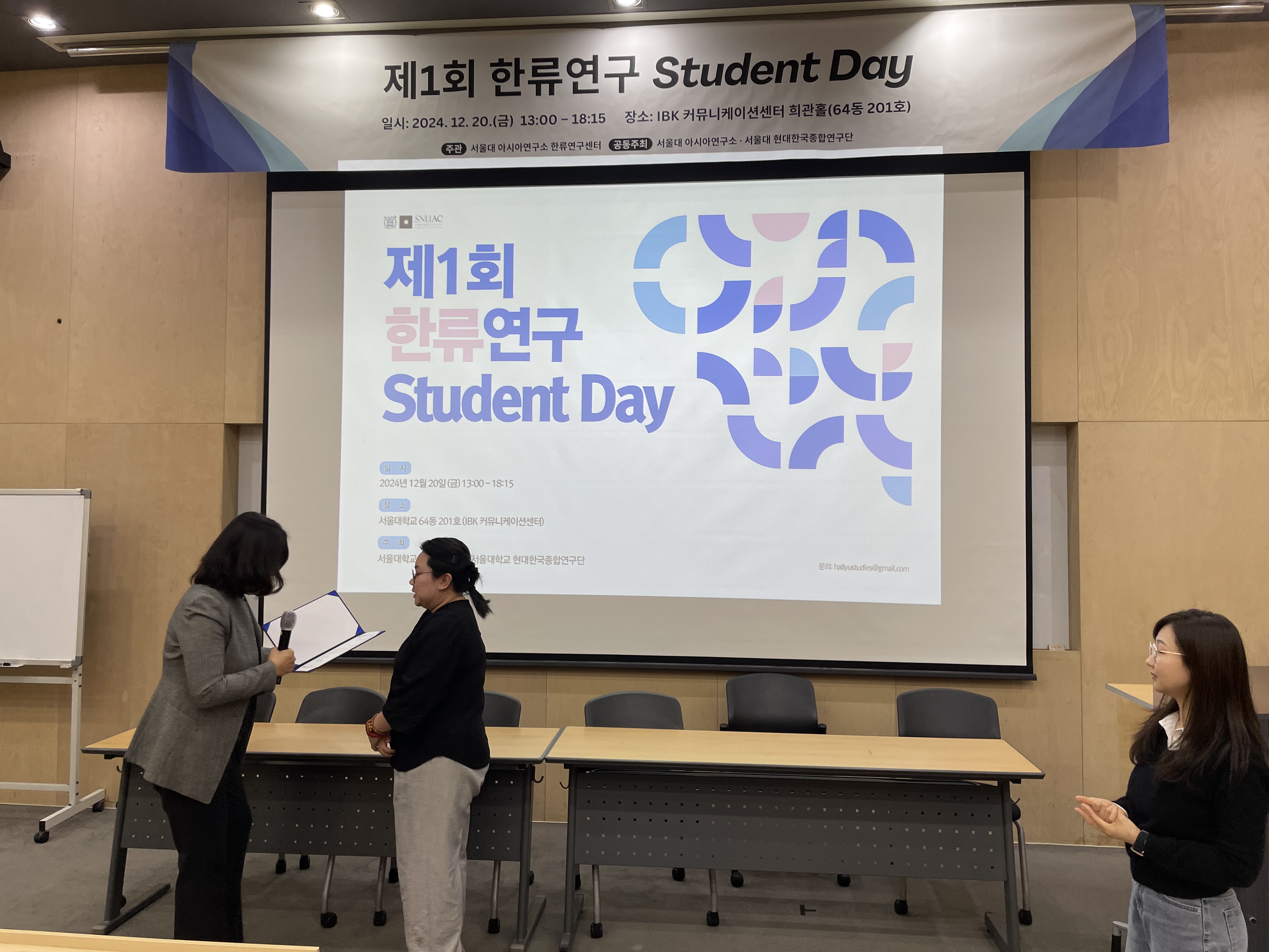 The “1st Hallyu Research Student Day” academic event was held at the IBK Communication Center, Seoul National University, from 1:00 PM to 6:15 PM on December 20, 2024. It was jointly organized by the Seoul National University Institute for Contemporary Korean Studies and the Hallyu Research Center at the Seoul National University Asia Research Institute.
