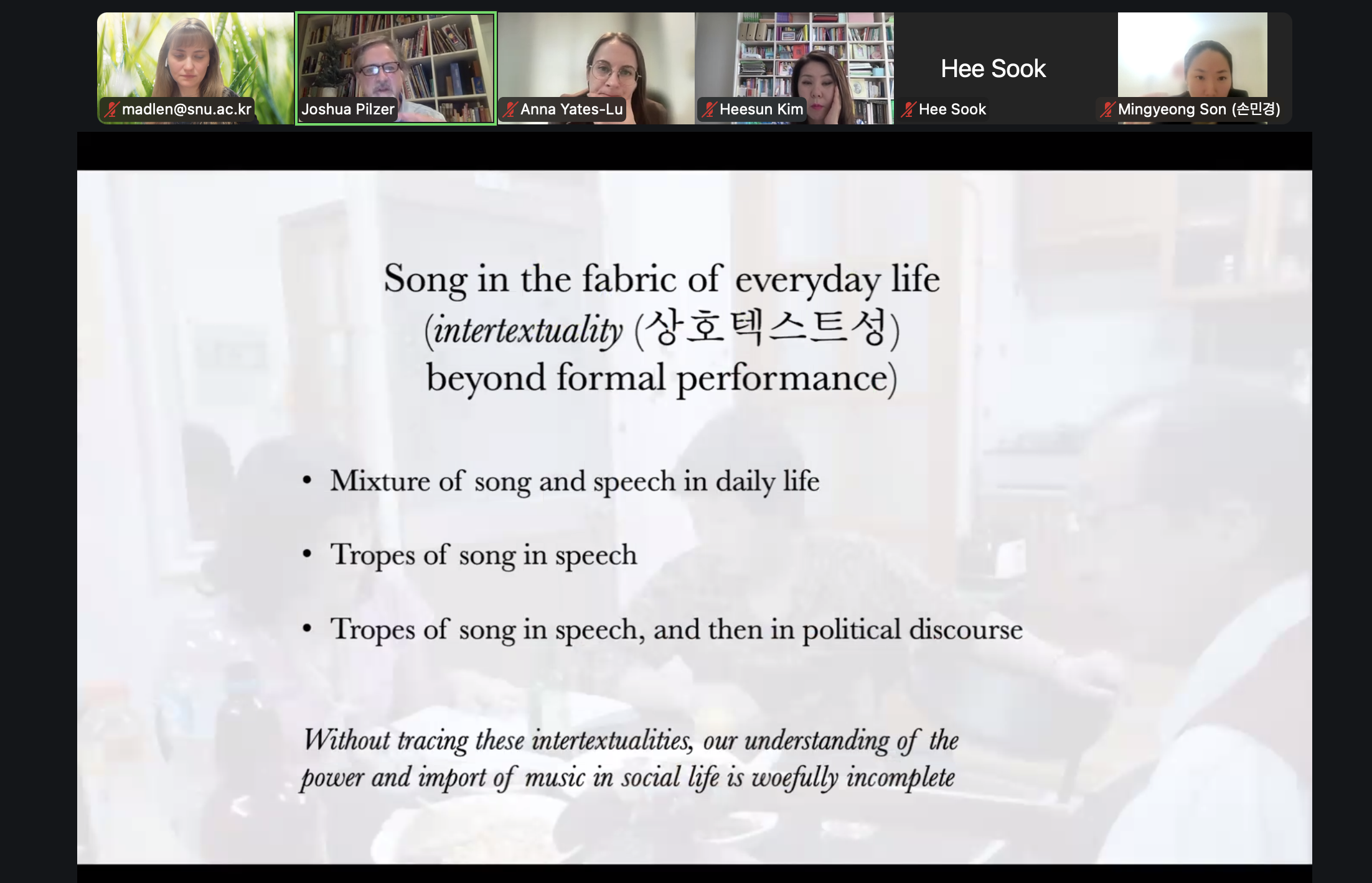 Drawing on field encounters with Han Jeongsun, the presentation explored how song extends beyond formal performance into everyday speech, emotional communication, and even social and political discourse.
