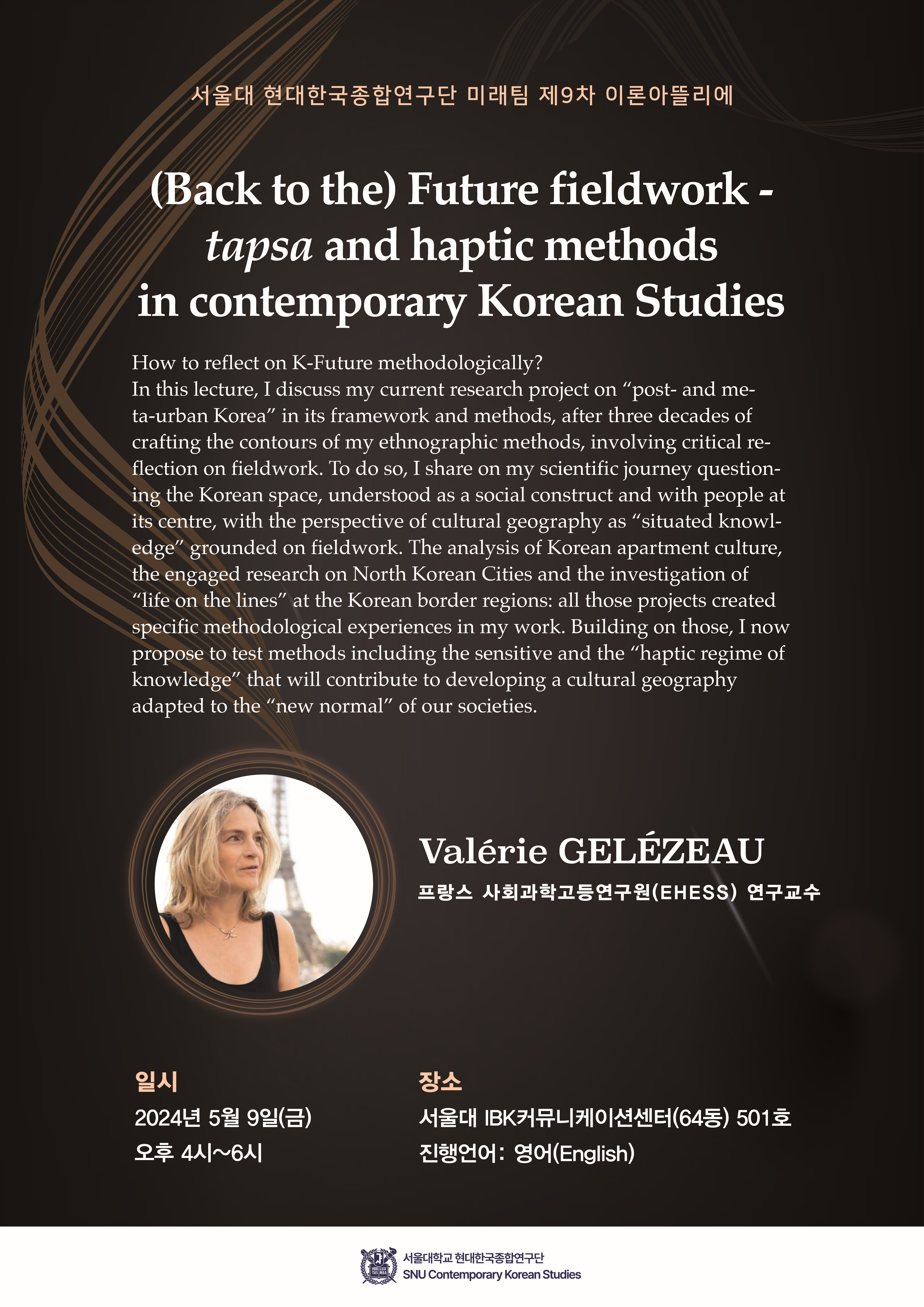 강연 소개:K-Future를 방법론적으로 어떻게 성찰할 수 있을까? 본 강연에서 나는 지난 30여 년간 현지조사에 대한 비판적 성찰을 포함한 민족지적 방법론을 구축해 온 경험을 바탕으로, 현재 진행 중인 ‘포스트-도시적·메타-도시적 한국’ 연구 프로젝트를 그 이론적 틀과 방법론 속에서 논의한다. 이를 위해, 한국의 공간을 사회적 구성물로 이해하고 그 중심에 사람들을 놓는 관점에서, 현지조사에 기반한 ‘상황적 지식(situated knowledge)’으로서의 문화지리학이라는 시각을 통해 한국의 공간을 질문해 온 나의 학문적 여정을 공유하고자 한다.