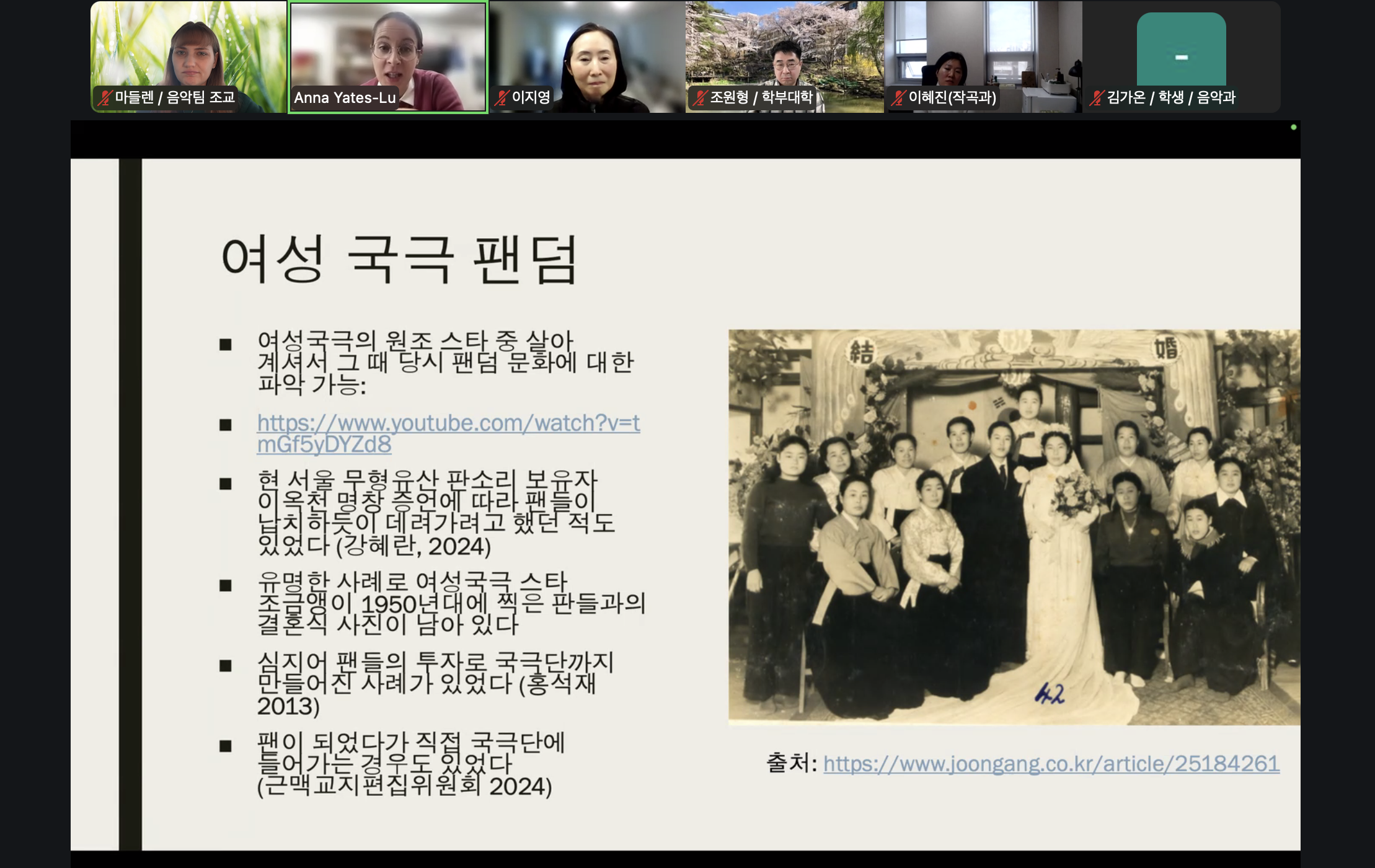 두 번째 발표에서 안나 예이츠 교수(서울대학교)는 여성국극과 창극을 중심으로 국악 팬덤의 역사와 발전 양상을 탐구하였다. 참여적 문화라는 관점에서 과거 여성국극 팬들의 적극적인 향유 방식부터 오늘날 디지털 환경 속 국악 팬덤의 활동까지를 연결 지으며, 국악 수용의 방식이 단순한 감상을 넘어 사회적 관계 형성과 문화적 실천으로 확장되고 있음을 보여주었다.