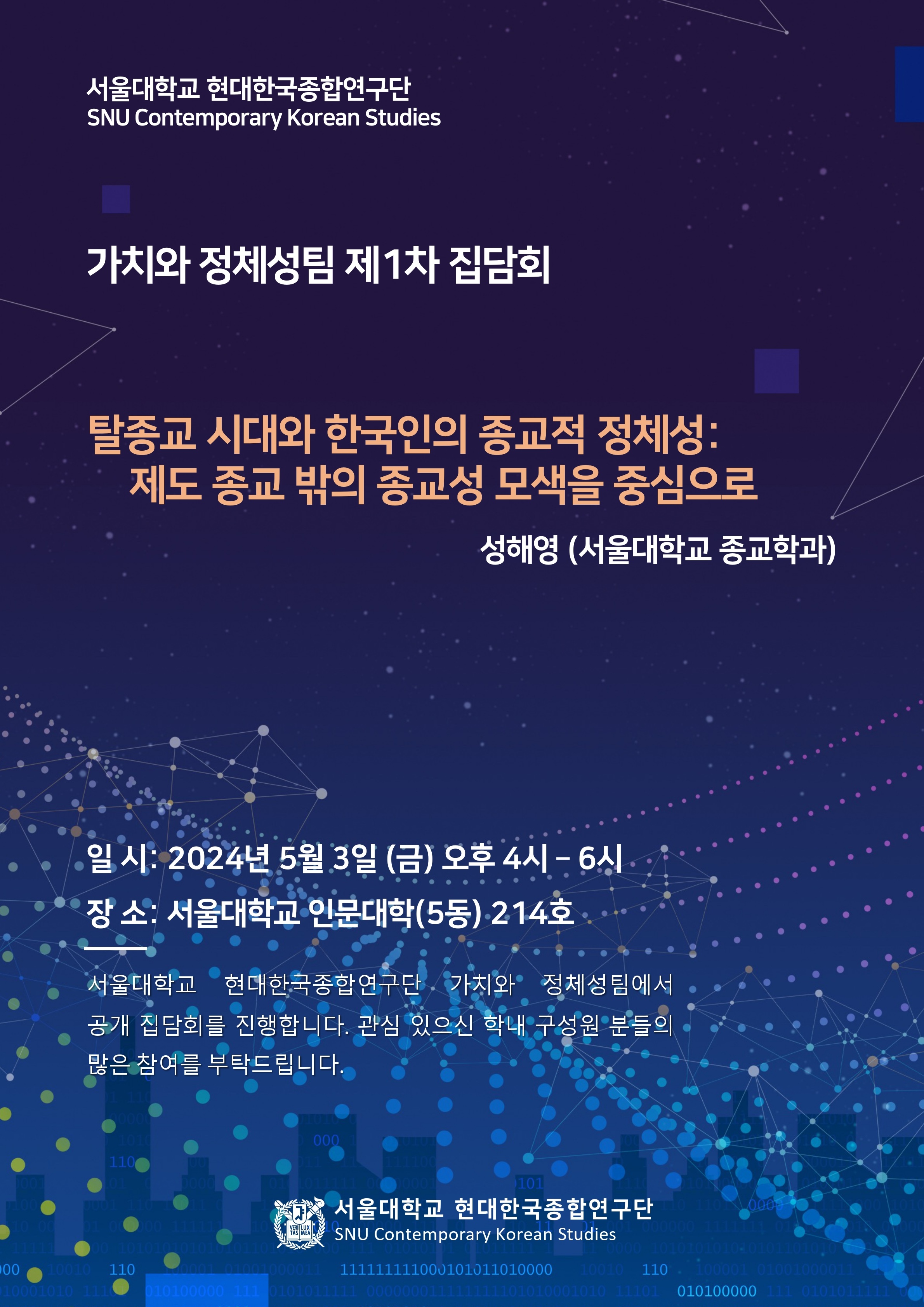 서울대학교 현대한국종합연구단 가치와 정체성팀에서 제1차 집담회를 진행합니다. 관심 있으신 학내 구성원 분들의 많은 참여를 부탁드립니다.