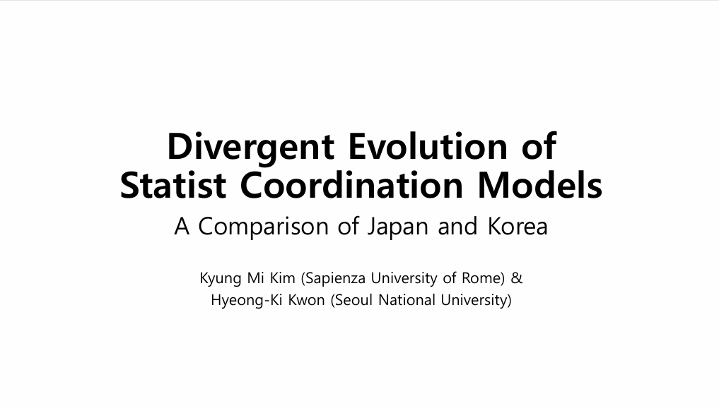첫 번째 발표는 김경미 교수와 권형기 교수가 공동으로 진행한 "국가 주도 조정 모델의 상이한 진화: 일본과 한국의 비교(Divergent Evolution of Statist Coordination Models: A Comparison of Japan and Korea)"였다. 발표에서는 일본과 한국의 국가 주도 경제 조정 방식이 역사적·제도적 요인에 따라 어떻게 다르게 발전하였는지를 분석하였다. 두 연구자는 양국의 조정 모델이 정책적 유연성과 조정 메커니즘 측면에서 어떤 차이를 보이는지를 이론적 틀을 바탕으로 비교·설명하였다.
